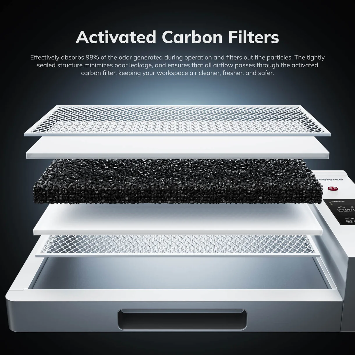 High-density activated carbon filter cotton absorbs up to 98% of odors generated during DTF curing and traps fine airborne particles for cleaner air.